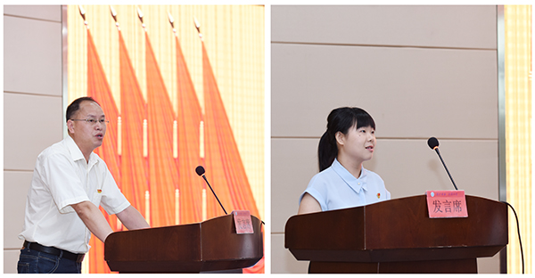 人文与社会科学学院党总支秘书学系党支部书记周玉华、经济与管理学院教师党员邓凌峰分别作为先进基层党组织代表、优秀共产党员代表发言,他们结合自己的工作实际,分享共产党员的奋斗故事。