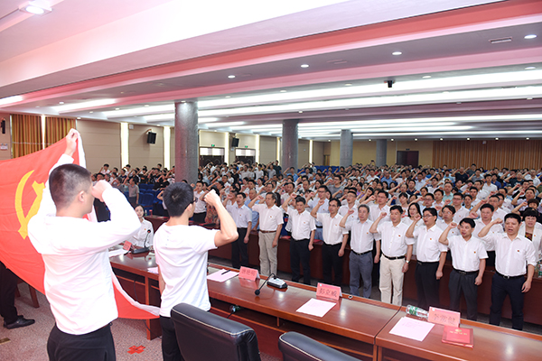 全体与会党员面对鲜艳党旗,一起重温了入党誓词。