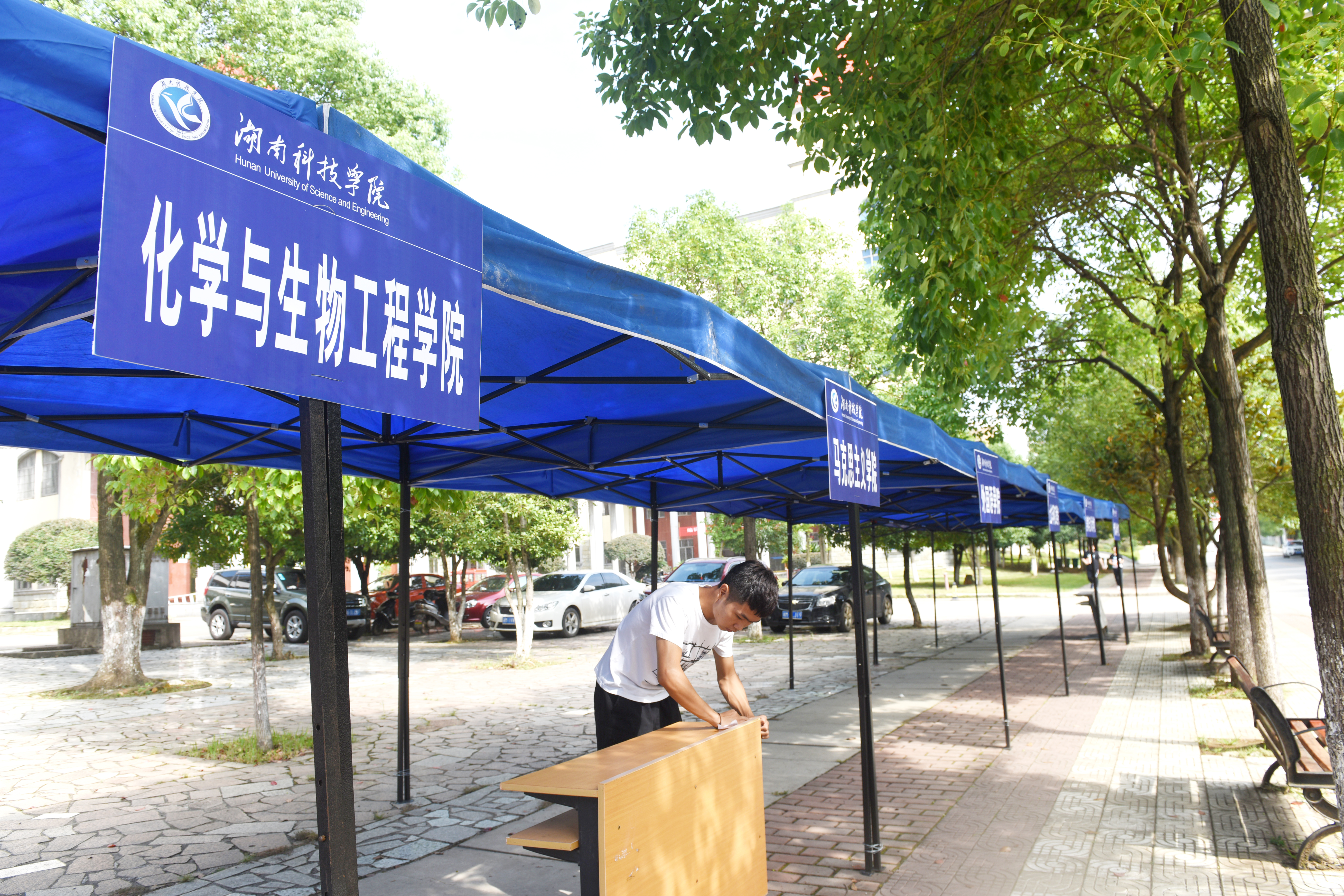 在综合教学楼前,迎新帐篷已经摆放整齐,正在静候新生到来。