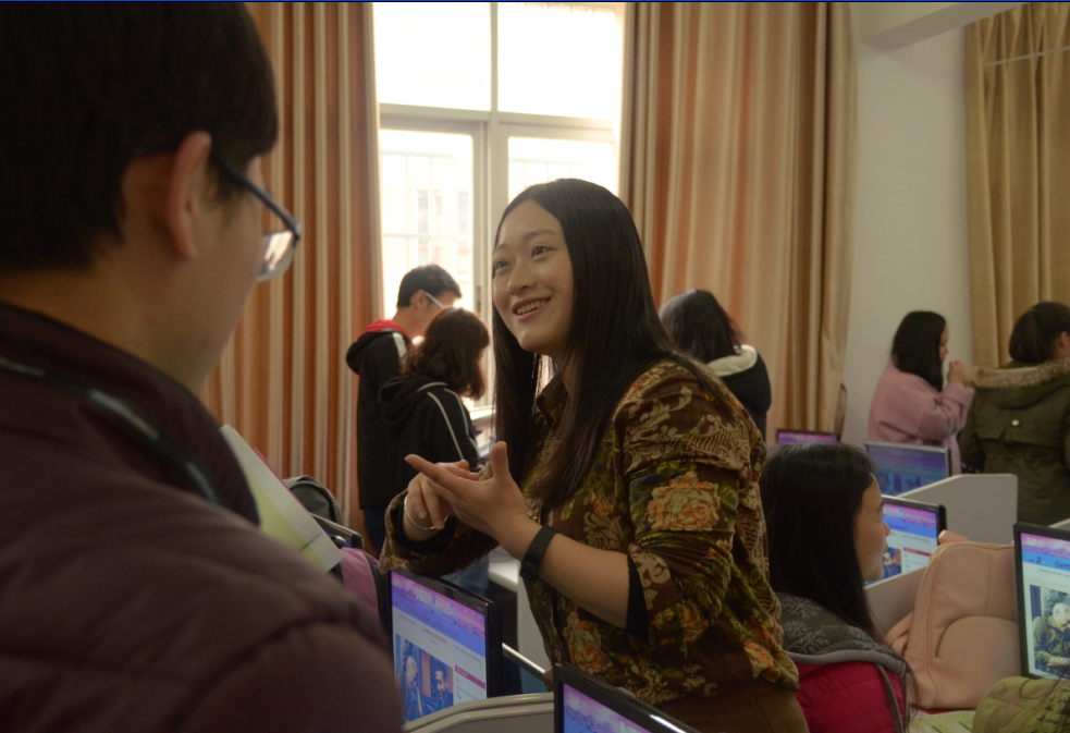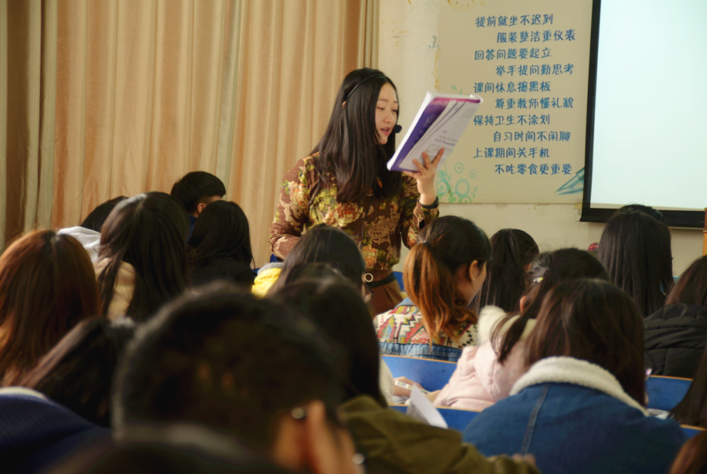 胡老师开始了自己今天的第一次授课——大学英语读写课。胡老师用启发式教学法带着学生们一起深度思考、理解课文,阅读过后给学生安排小组讨论任务,她也积极参与到小组的话题讨论中了解并指导学生的思路。