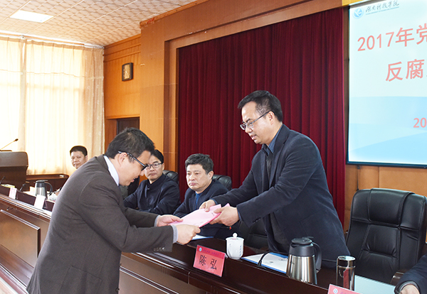 陈弘指出,此次会议主要任务是坚定不移地推进我校党风廉政建设,不断提升全面从严治党科学化水平。他就落实党风廉政建设和反腐败任务提出要求:一是要认清形势,保持高度的思想自觉和行动自觉。二是要精准发力,深入推进党风廉政建设和反腐败斗争。他强调,要压实管党治党这个责任,织密党风廉政建设工作网络;抓实思想建党这个根本,筑牢防腐拒变思想道德防线;夯实组织建设这个基础,发挥党组织和党员监督作用;管实作风建设这个重点,营造风清气正劲足干事环境;落实制度治党这个关键,扎紧全面从严治党制度笼子;做实反腐倡廉这个保障,构建不敢不能不想腐的机制。陈弘希望大家一定要从关系学校发展命运的高度,不断强化责任、勇于担当,以“党要管党、从严治党”的政治责任,以“踏石留印、抓铁有痕”的务实作风,全面深入推进学校党风廉政建设和反腐败工作,为学校转型发展、创建“双一流”和净化教书育人环境营造风清气正的政治生态。