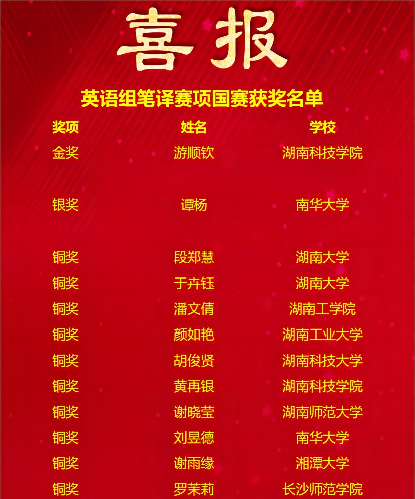 近日,2023“外研社·国才杯”“理解当代中国”全国大学生外语能力大赛英语组国赛落幕,赛事包含了演讲、阅读、写作、笔译、口译五个分项。经激烈角逐,我省高校喜获佳绩,共获得金奖5项,银奖29项,铜奖46项。其中,演讲组获得金奖2项,全国排名第三;阅读组获得金奖1项,全国排名第四;写作组获得金奖1项,全国排名第四;笔译组获得金奖1项,全国排名第八。