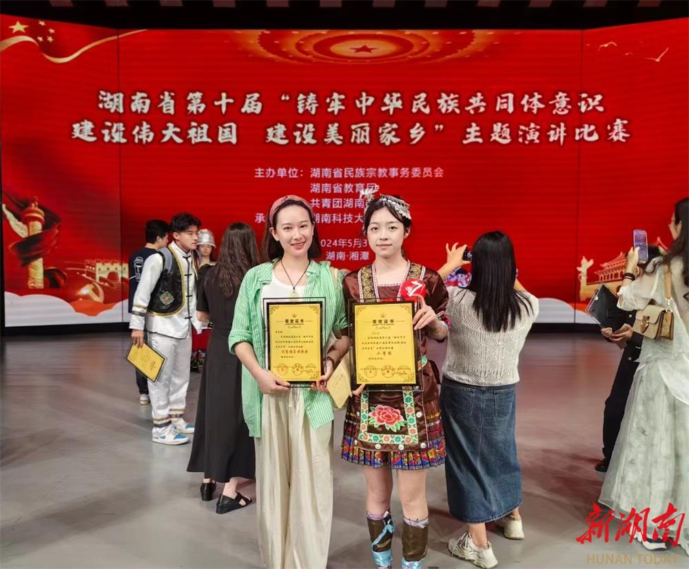 湖南日报·新湖南客户端6月7日讯(通讯员 向薛峰)近日,湖南省第十届“铸牢中华民族共同体意识 建设伟大祖国 建设美丽家乡”主题演讲比赛在湘潭市举行,赛事由湖南省民族宗教事务委员会、湖南省教育厅、共青团湖南省委联合主办,湖南科技大学承办。米兰官方端网页版传媒学院学生周怡希代表永州市高校参加比赛,荣获高校组二等奖,袁晓琳老师荣获“优秀指导老师奖”。