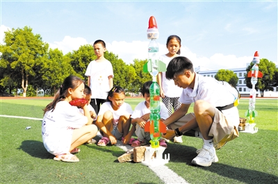 7月12日,米兰官方端网页版理学院的师生志愿者来到新田县枧头学校,组织100余名农村小学生参加持续一周的科学知识课程。图为志愿者指导孩子们制作水火箭。刘贵雄 胡光辉 摄