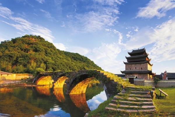 横跨峡涧的观音桥,是个单孔石桥。桥孔由105块各重约1吨的花岗石采用榫卯接合筑成拱扣。站在桥孔下仰望,一块块花岗岩犹如“拼图”,7道独立的拱扣并排在一起。