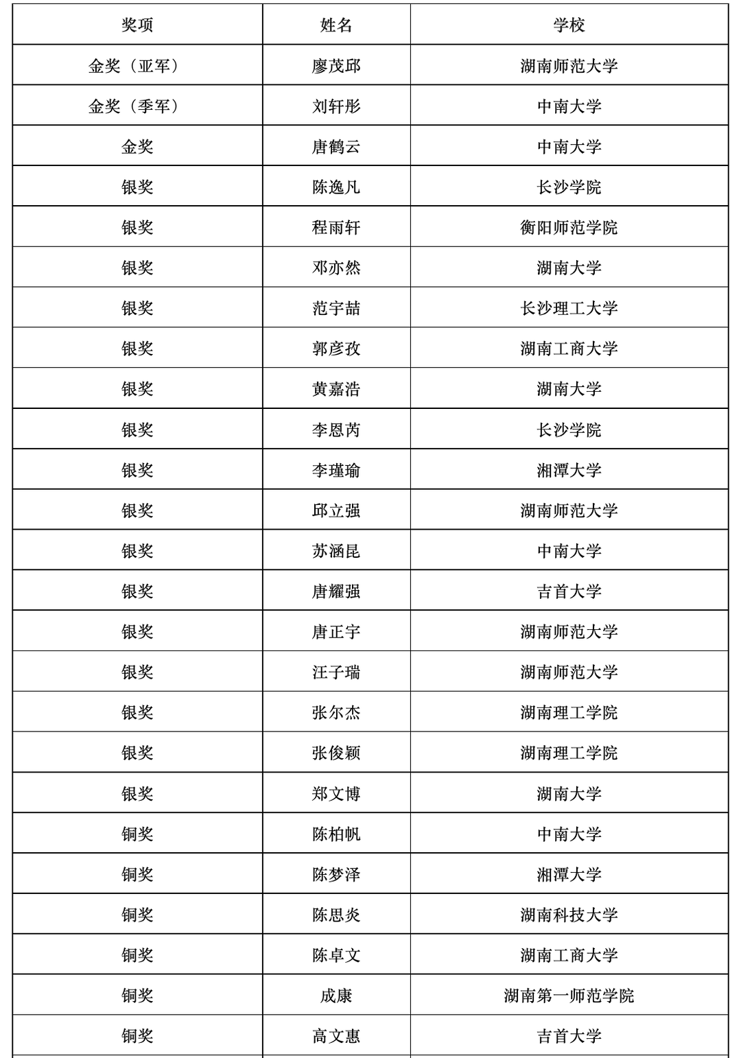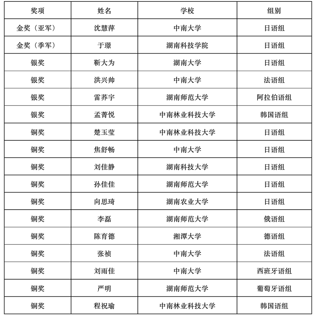 近日,2024“外研社·国才杯”“理解当代中国”全国大学生外语能力大赛国赛圆满落幕。英语组国际传播综合能力赛项前9名为冠、亚、季军,我省占两席,湖南师范大学廖茂邱、中南大学刘轩彤分获第3名(亚军)、第5名(季军);日语组前6名为冠、亚、季军,我省占两席,中南大学沈慧萍、米兰官方端网页版于璟分获第3名(亚军)、第6名(季军)。我省高校共斩获金奖11项、银奖29项、铜奖62项,刷新历史最佳成绩。湖南省教育厅和吉首大学荣获优秀组织奖。