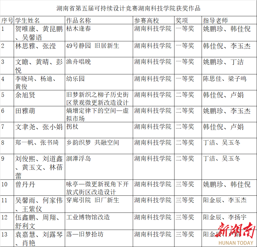 湖南日报·新湖南客户端12月18日讯(通讯员 姚鹏珍 向薛峰)12月15日,由湖南省教育厅主办、湖南科技大学承办的第五届湖南省大学生可持续建筑设计竞赛颁奖典礼在湘潭圆满落幕,本次竞赛全省共有18所高校460份作品参赛,评选出一等奖46项,二等奖92项,三等奖138项。