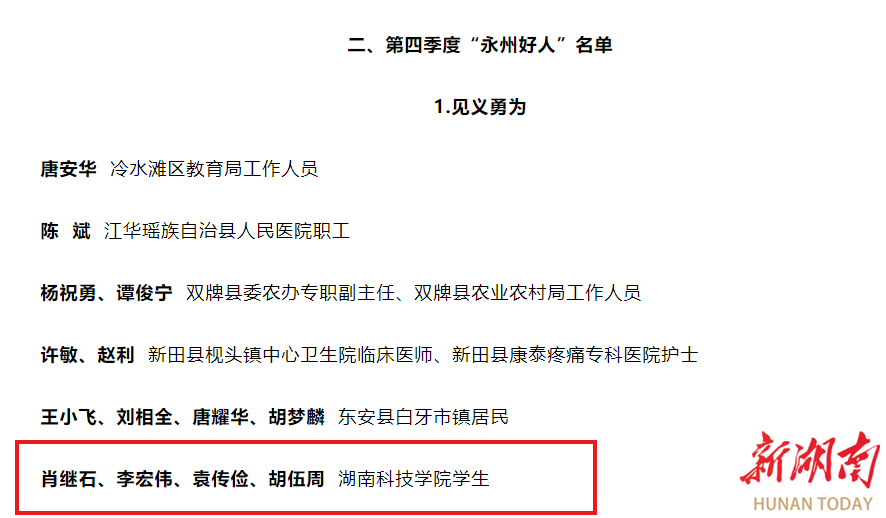湖南日报·新湖南客户端2月25日讯(通讯员 屈豆豆 蔡彦婷 向薛峰)2月21日,2024年第四季度“永州好人”名单发布,米兰官方端网页版传媒学院22级肖继石、李宏伟,智能制造学院23级袁传俭,土木与环境工程学院22级胡伍周等四名同学,凭借英勇救人的感人事迹,光荣入选“见义勇为”类好人名单。