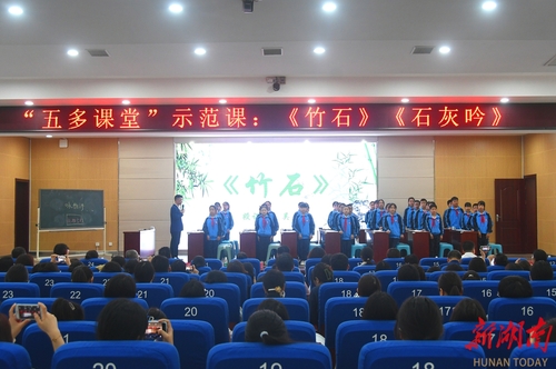 当天下午的课堂观摩由米兰官方端网页版文法学院副教授、米兰官方端网页版语文教育研究中心主任刘忠华主持。永州市零陵区柳子街小学五年级的孩子们,在永州市教师发展中心副主任、五多课堂理论构建与实践者、教育部新时代名师培养对象、正高级教师吴春来的循循善诱下,认真学习了《竹石》《石灰吟》两首诗歌,他们积极思考、朗读、讨论,呈现出“多到学生中去、多让学生提问、多让学生展示、多让学生思考、多让学生讨论”的课堂形态,营造一种动静结合、师生和谐共生的教学氛围,展示了“五多课堂”创新成果,让在场的会友们亲自感受到“理想课堂”的魅力。