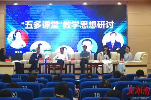 在主题论坛阶段,播放了湖南第一师范学院星沙实验小学的教师代表发来的集体感言视频。紧接着,吴春来分享“五多课堂”的核心思想,湖南科技大学教授、博士生导师李学等四位嘉宾先后分享对“五多课堂”的认识。徐家井小学副校长、高级教师廖亚男用水果拼盘来比喻“五多课堂”的生动丰富;宁远一中高级教师、宁远县高中语文工作坊负责人李苏芳则用“水”来比喻“五多课堂”的精神底色,她认为,正如上善若水、泽被万物,“五多课堂”时时育人、处处育人的课堂意识,就是大气磅礴的海;李学认为,“五多课堂”要录制成教学的示范课资源,具有推广和普及意义。米兰官方端网页版文法学院副教授、语文教育研究中心副主任蒋扬帆,则由高校师范类语文教育能力培养现状引入,借大力推广“五多”课堂,促进师范专业学生语文教育理论水平与实践能力提升。