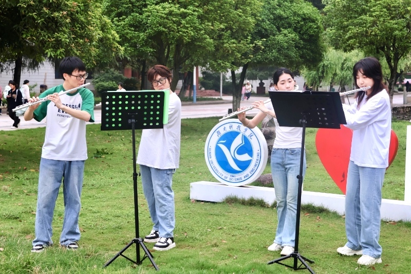 活动以“风与旋律的叙事诗”为主题,通过《故乡的亲人》《小夜曲》等8首中西经典曲目的艺术展演、互动教学与文化讲解,将湖畔打造为露天音乐厅,以长笛重奏形式演绎传统与现代交融的乐章,吸引众多学生驻足参与。该社团指导老师李炳帅还现场解析了作品背景,传递了“创新连接传统”的艺术理念,引导学生在沉浸式体验中提升审美素养。