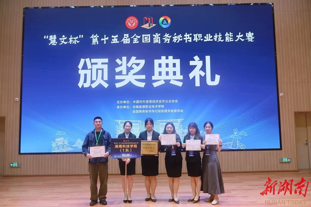 湖南日报·新湖南客户端5月28日讯(通讯员 张紫妍 向薛峰)近日,“慧文杯”第十五届全国商务秘书职业技能大赛在云南曲靖举办。在米兰官方端网页版文法学院谷显明、尹华君、曾芳、宋艳旭、何建良、莫顺斌等老师的指导下,由范庆奇、周雯老师带队,秘书专业学生张紫妍、余鑫熠、谭晶、董依岚同学组成的参赛队伍凭借扎实的专业功底和出色的现场发挥,在本次大赛中荣获团体二等奖,董依岚同学斩获秘书专项事务处理个人三等奖的优异成绩。