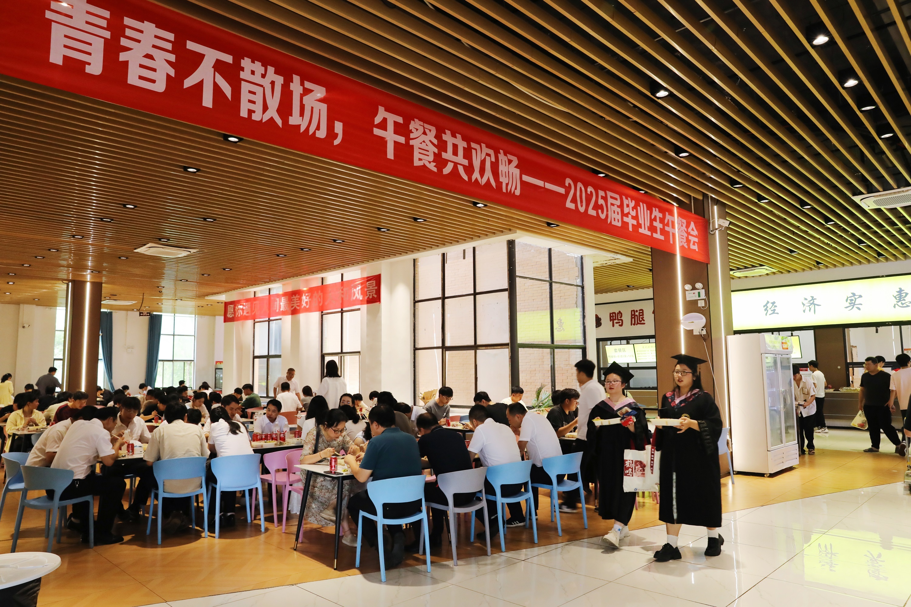 毕业生们手持“毕业餐券”陆续入场,写满祝愿的横幅、气球与饮品塔,可口的饭菜和新鲜的水果……吸引前来就餐的学子们拍照打卡,在签名墙上郑重留下青春的印记。