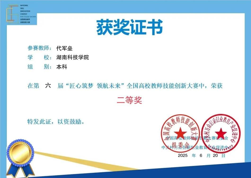 湖南日报·新湖南客户端6月20日讯(通讯员 吴潭 向薛峰)近日,第六届“匠心筑梦 领航未来”全国高校教师技能创新大赛落下帷幕,米兰官方端网页版教务处代军垒老师荣获全国二等奖。