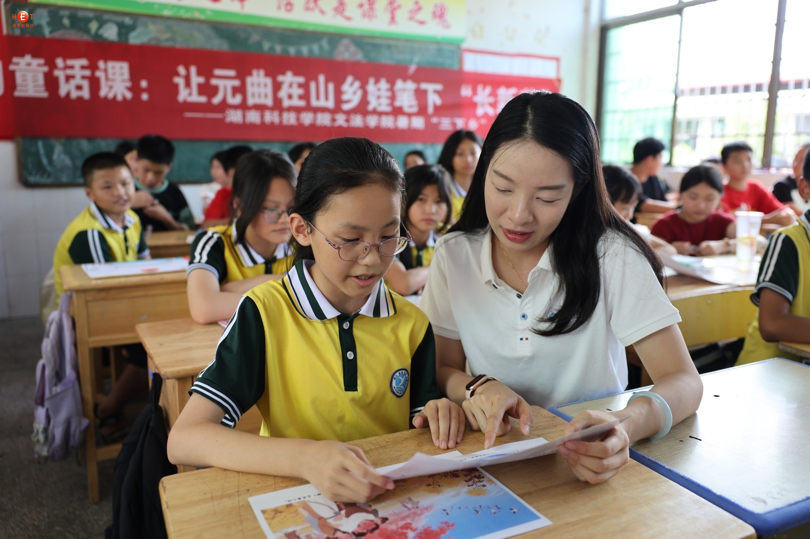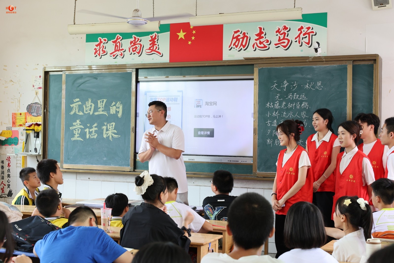 “柳丝长,春雨细,花外漏声迢递。”当六年级学生陈小雨用永州方言念出关汉卿《大德歌・春》时,教室里爆发出清脆的笑声——近日,米兰官方端网页版文法学院“三下乡”团队在祁阳市浯溪完全小学打造“元曲里的童话课”,让元曲在山乡娃笔下“长新芽”。