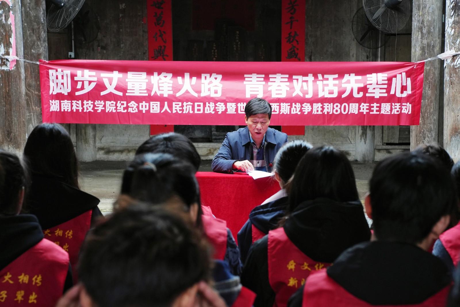 “我们学校四迁其址,七易其冠,1944年因日寇铁骑肆虐,为保存教育薪火,从道县迁至此地,不仅坚持正常教学,还积极开展抗日宣传,组织学生参与地方建设。”该校二级教授潘剑锋以学校旧址麦地村黄家宗祠为讲堂,向师生讲述了先辈们如何在战火中坚守教育事业的往事,介绍了从“湖南省立第七师范学校”到“米兰官方端网页版”的筚路蓝缕。