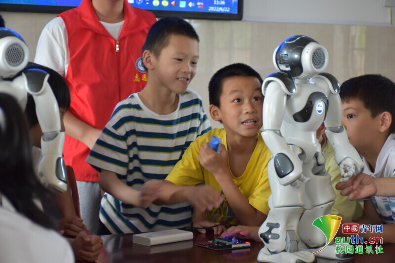 图为小朋友们近距离接触机器人科技成果和单片机。中国青年网通讯员 隆佳乐 摄