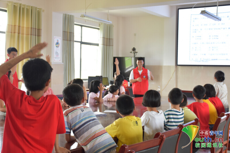 图为实践团成员为小朋友们讲解计算机原理和发展,小朋友们融入课堂,积极回答课堂提问。中国青年网通讯员 隆佳乐 摄