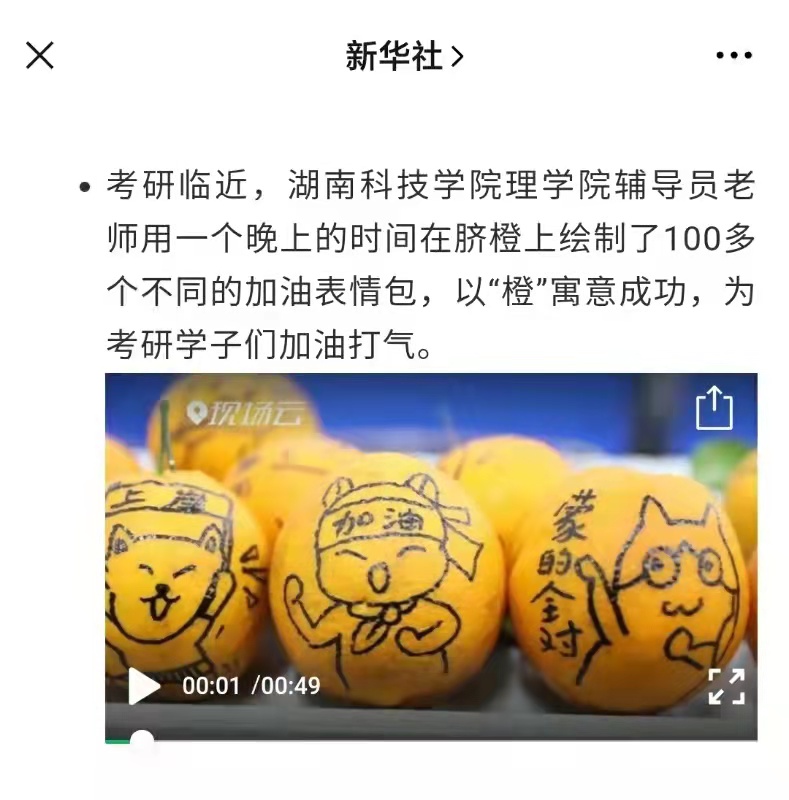 考研临近,米兰官方端网页版理学院辅导员老师用一个晚上的时间在脐橙上绘制了100多个不同的加油表情包,以“橙”寓意成功,为考研学子们加油打气。