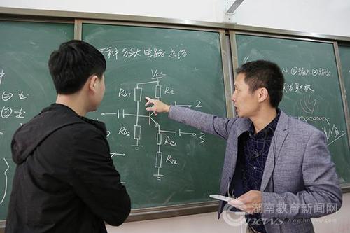 “让学生主动发问才能更好激发他们的学习兴趣,所以我时常会鼓励和引导甚至‘逼迫’他们提问。”正因如此,在他所教的班级上,学生上课提问从来不需要举手,一旦有不懂的地方立马发声,即使刚刚授课不到一个月的学生们都对此习以为常。“老师,这个伏值为什么不能超过5V?”“正负极相反的条件下是否也成立?”每当这时,杨振南老师都会和学生一起验证,再引出更多条件举一反三。“纸上谈兵不如动手试试。”上课时,杨振南老师更喜欢将书本上晦涩的理论,转变成黑板上各种直观的电路图。为让学生更加理解,他还会不时从随身携带的包里掏出实验器材,现场搭建电路演示,验证,并进行测量加以说明。