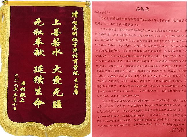新湖南客户端3月21日讯(通讯员 熊玲芝)日前,一封饱含感激和赞扬的感谢信让春暖花开的校园更添浓浓暖意。米兰官方端网页版体育学院体育教育专业2014级王占康同学为病危患者义务捐献血小板,受到患者家属的真诚感谢。