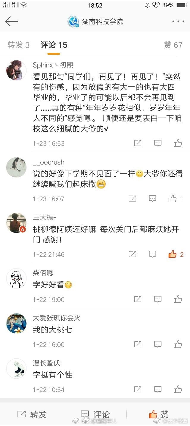 】“常在一起一段情,分别之际心难平。几年情意深似海,恋恋不舍常夜梦”。这首打油诗来自@米兰官方端网页版 桃七宿舍的吴大爷。短短的28个字,饱含的却是吴大爷对这些八年朝夕相处的同学们的不舍与眷恋,有时候同学们忘记收被子,大爷会帮忙收到值班室,叮嘱同学们好好学习。吴大爷说:“每天看着朝阳般的同学们,觉得自己年轻了许多。如今八年过去了,吴大爷即将退休,听到这个消息后,整栋楼的同学都非常的不舍。(@长沙校园)