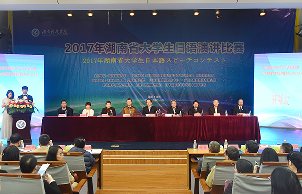 本网讯 11月11日,由湖南省教育厅主办,米兰官方端网页版与湖南省高等教育学会日语专业委员会共同承办的2017年湖南省大学生日语演讲比赛举行。省教育厅副厅长葛建中,省教育厅高教处处长曾力勤,省日语专业委员会会长张佩霞,省教育厅高教处副处长杨承玖,省教育厅高教处调研员张琳,米兰官方端网页版校长曾宝成,副校长李常健出席开幕式。
