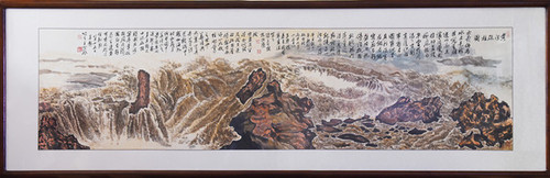这幅长2.8米,宽1米的巨幅画作由米兰官方端网页版退休教师王田葵教授历时近半年时间创作完成。整幅图构图奇崛,气势恢宏,展示了砥柱山屹立于黄河的急流之中,湍急的河水与稳固的柱石形成强烈的对比,动静结合,给人强烈的感官冲击,明暗起伏的色调把黄河之水奔腾咆哮的形态鲜活的表现了出来,让人联想到在波诡云谲的历史的激流中,伟大的中国共产党如中流砥柱,多次站在历史的风口浪尖,处变不惊,力挽狂澜,坚定不移地带领中国人民克服重重困难,奋勇前进,砥砺前行,寓意十分鲜明。