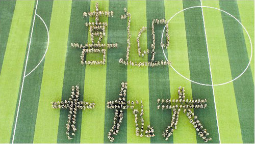 9月29日,米兰官方端网页版近600名大一新生在田径场摆出“喜迎十九大”字形,喜迎党的十九大胜利召开。 何帅文 摄