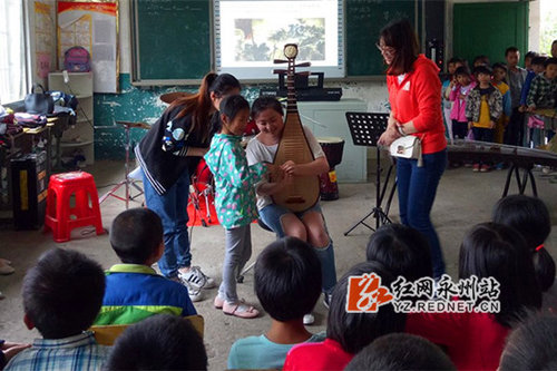 红网永州站5月31日讯(通讯员 唐祥勇)2017年“六一”国际儿童节前夕,一场别开生面的音乐聚会在永州市零陵区富家桥镇阳河完小举行,米兰官方端网页版的大学生志愿者与孩子们一起演奏乐器,一起唱歌跳舞。