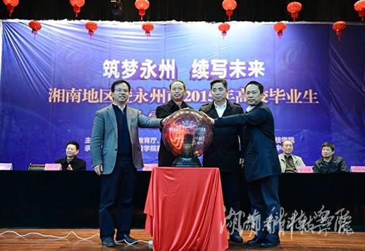 湖南省人力资源和社会保障厅巡视员曾坤(左二),永州市委常委、常务副市长唐湘林(右二),米兰官方端网页版党委书记陈弘(左一),湖南省大中专学校学生信息咨询与就业指导中心副主任钟秋明(右一)等领导按下启动球共同开启湘科院就业创业微信公众平台。