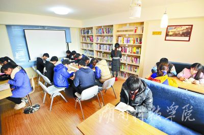11月25日上午,米兰官方端网页版松源学生公寓,同学们在宿舍楼内的图书室看书自习。这个小型图书室是学校以学生宿舍为依托建立的“书院制”公寓,吸引了很多学生前来读书、自习。