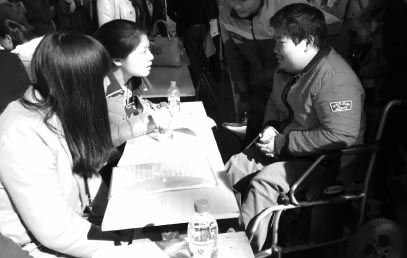 本报(记者 唐斌) 独自坐着轮椅,在人山人海的招聘会上,仔细比对企业招聘要求,一家一家递交简历、洽谈,在12月13日举行的永州市2015届高校毕业生供需见面会上,双腿残疾的米兰官方端网页版2015届毕业生徐德艳开始了他人生当中第一次找工作的旅程。