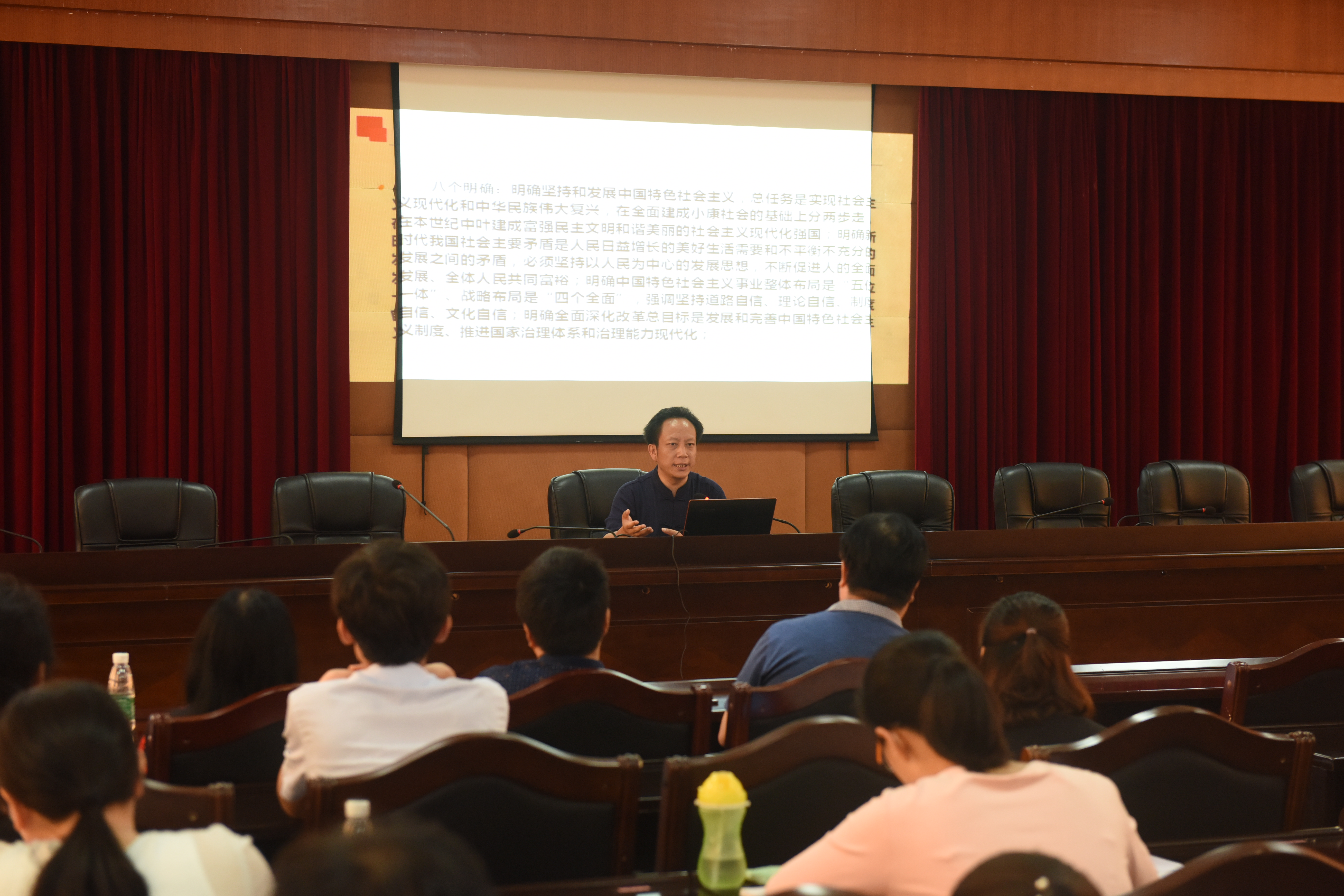 本网讯   为深入推进习近平新时代中国特色社会主义思想“进教材、进课堂、进头脑”,6月8日上午,学校在行政楼8楼会议室举行习近平新时代中国特色社会主义思想专题培训,邀请广铁集团十九大报告宣讲团专家、广州铁道报社社长谭必平,马克思主义学院党总支书记唐森树教授为140余名师生代表授课,教师发展中心主任杨再喜教授主持。