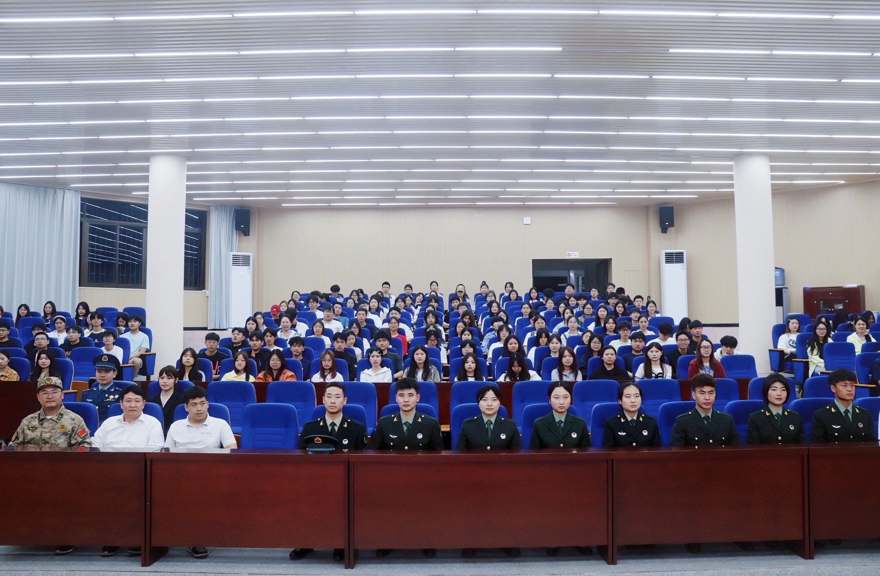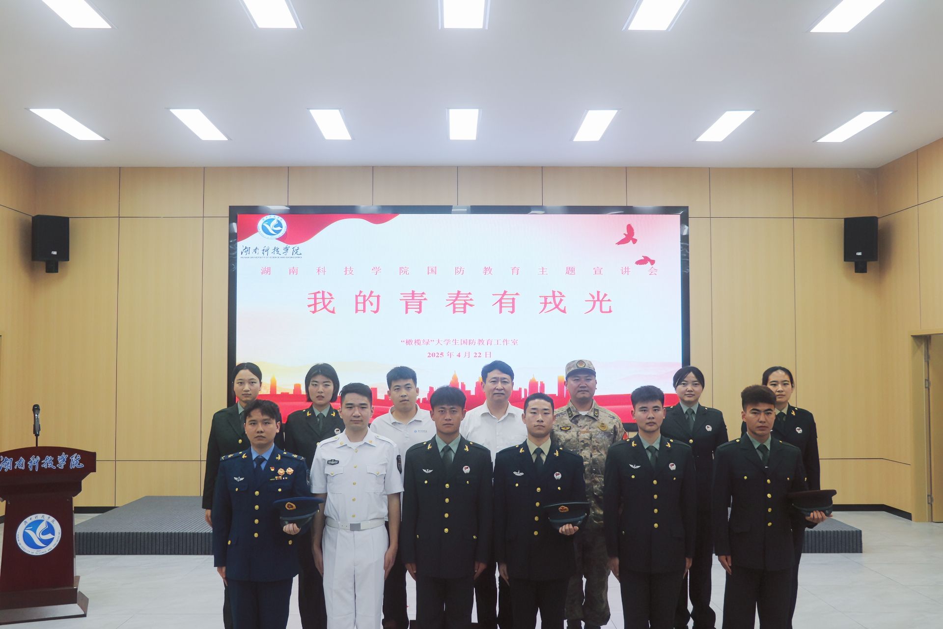 由退役大学生代表组成的国防教育宣讲团身着整齐的军装,英姿飒爽地走上讲台,依次分享自己的军旅事迹。宣讲团成员们用朴实而真挚的语言,讲述了在部队中经历的热血与担当、成长与蜕变。