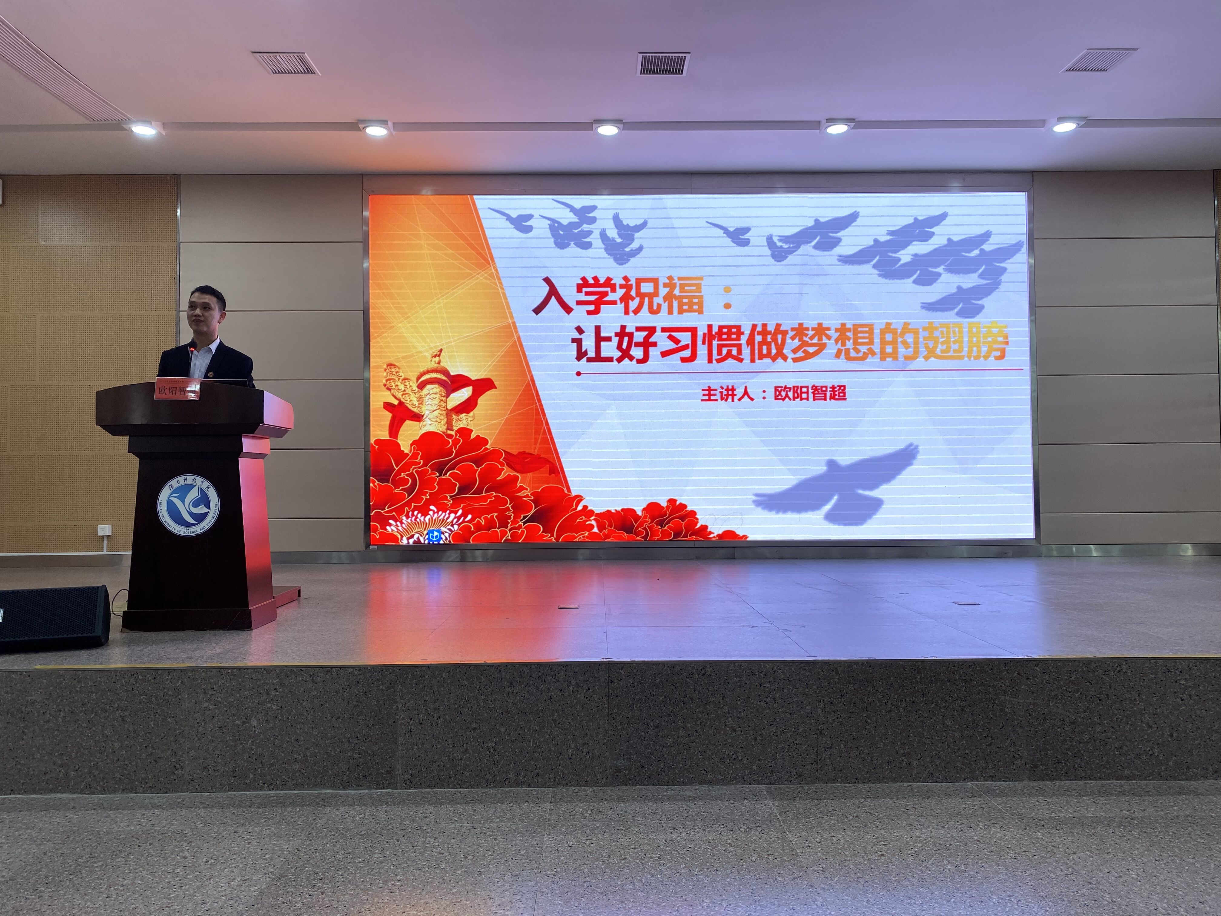 辅导员欧阳智超作了主题为《入学祝福:让好习惯做梦想的翅膀》的讲座。讲座伊始,欧阳智超带领全体新生举行了迎新入学“感恩致谢”仪式,引导新生用实际行动向师长、父母敬礼道谢。