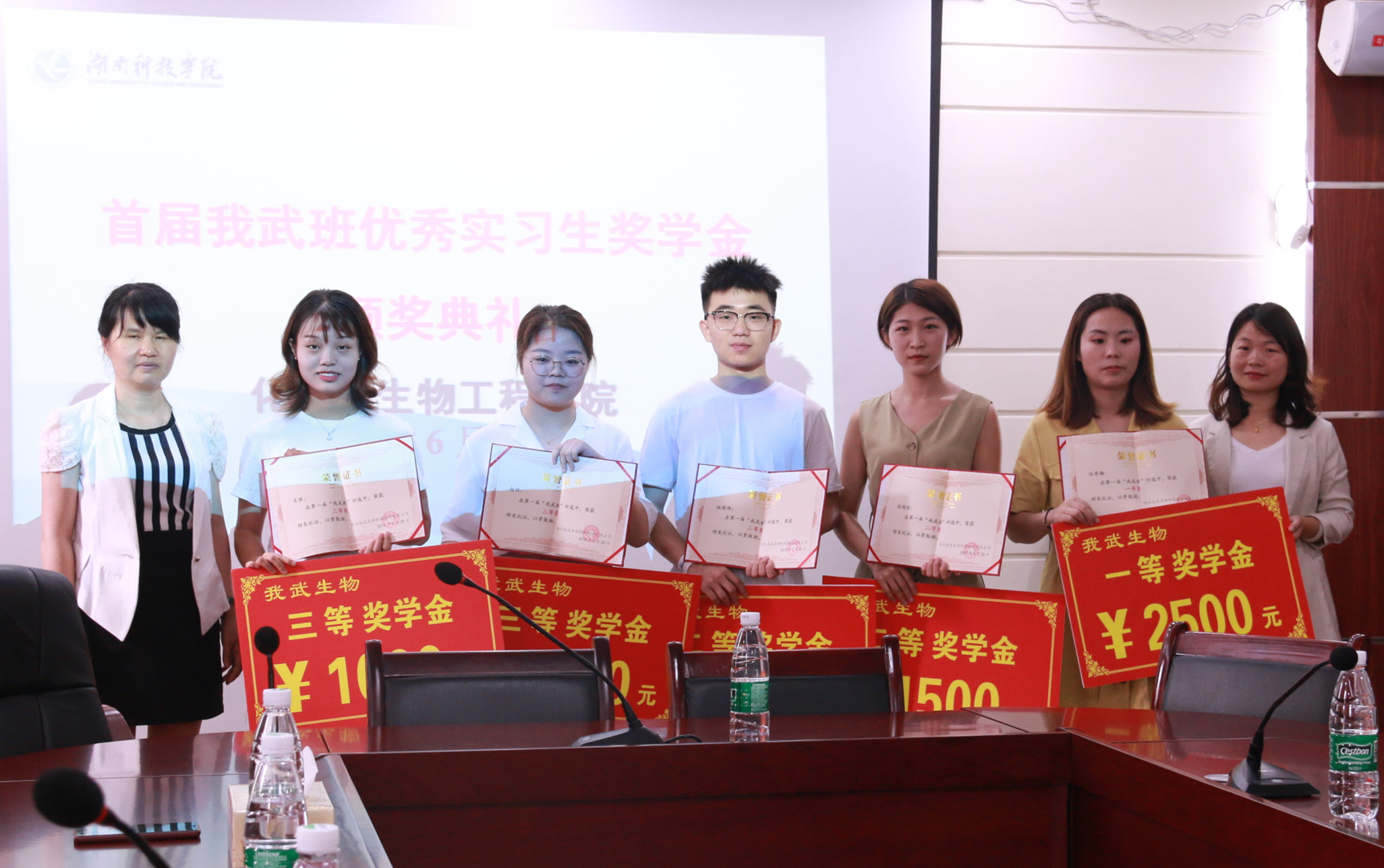 本网讯 6月25日上午,化学与生物工程学院首届“我武班优秀实习生奖学金”颁奖典礼在逸夫楼举行,浙江我武生物科技股份有限公司副总经理王立红,该院院长刘小文、党总支书记曾二青等参加。