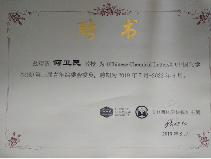化生学院:何卫民受聘为《Chinese Chemical Letters》青年编委会委员