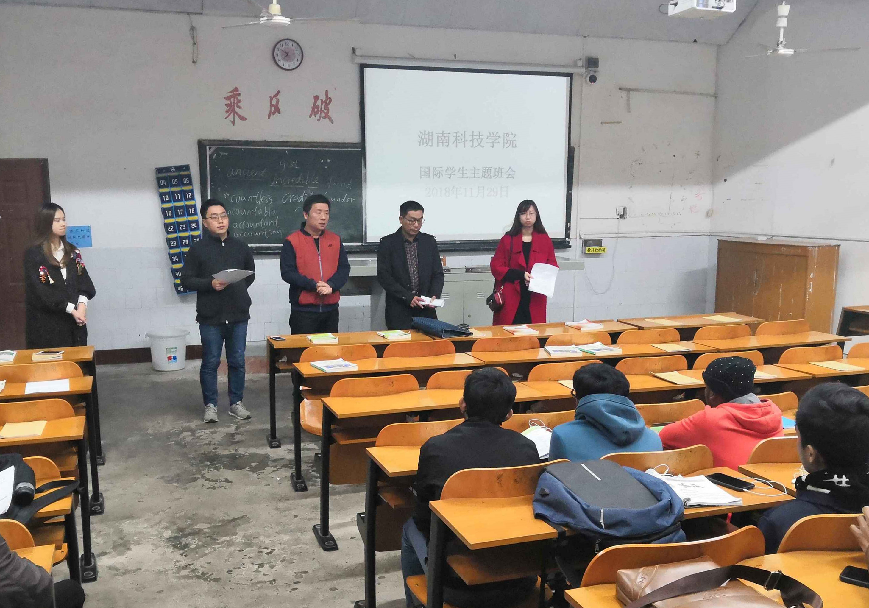 本网讯  11月29日晚,在博雅楼东1-1教室召开国际生第二次班会,国际交流处处长郑际根,外国语学院党总支副书记王瑛以及第二批全体国际生参加。