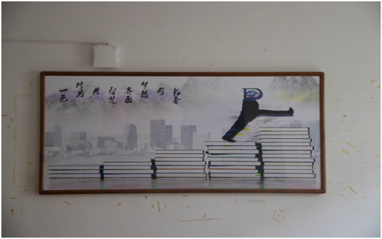 各教室前墙上方统一悬挂着国旗和校旗,黑板两侧悬挂校训条幅,展示着学校的办学理念和价值追求。各教室梁柱上悬挂经典名句书法条幅。此外,还发动各专业学生,围绕学科特点,以专业的经典知识为主要内容,精心设计主题鲜明、专业特色突出的主题文化展板。广电专业教室主题文化展板是“广电”意象人物踏着书籍的台阶迈进,编导专业是经典阅读延伸出优秀电影的胶片。