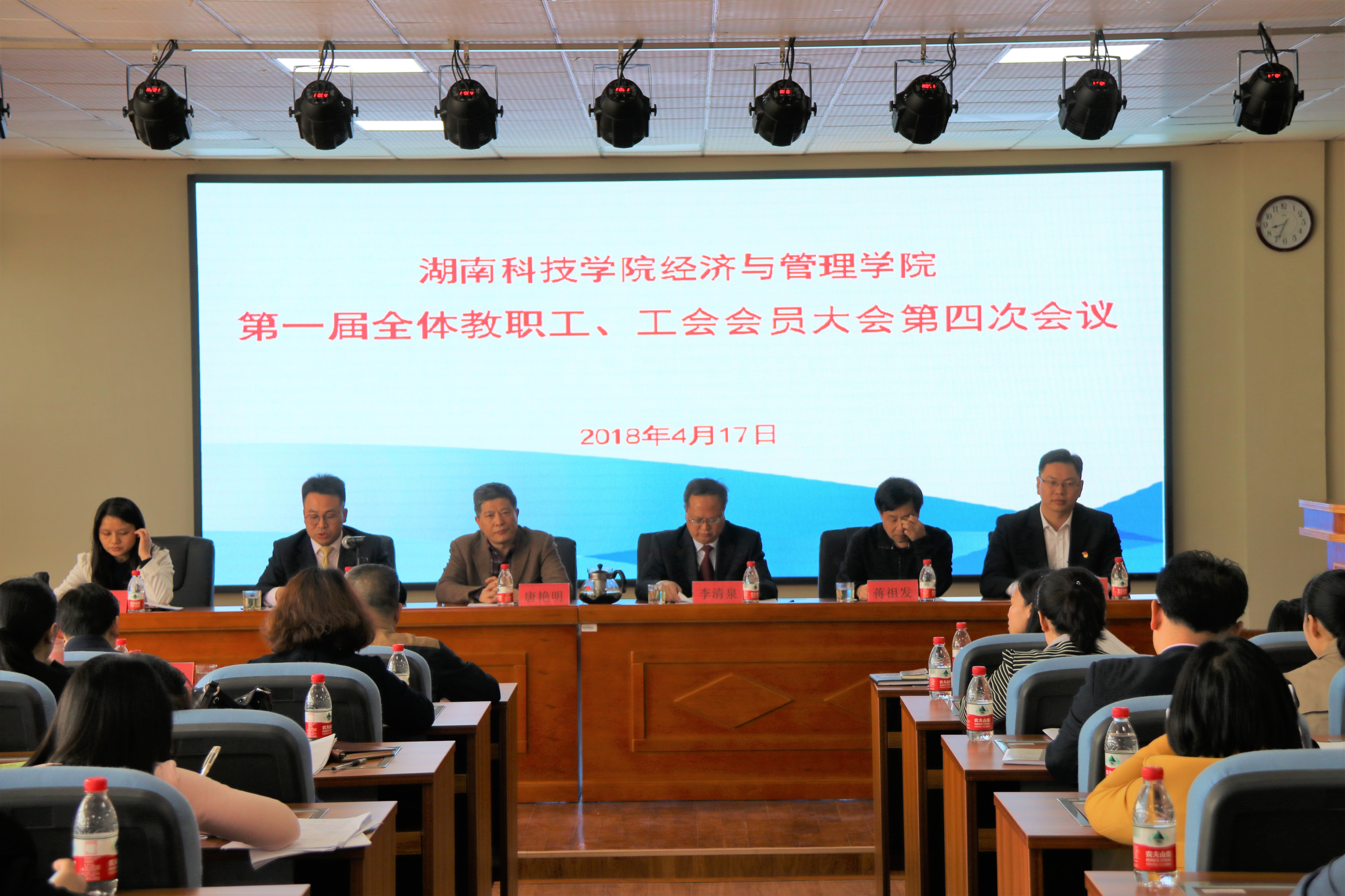 本网讯  4月17日下午,经济与管理学院第一届全体教职工、工会会员大会第四次会议在明理楼702召开。校党委副书记、工会主席唐艳明,工会副主席蒋祖发,校友办主任张恒俊应邀出席会议,该院全体教职工和学生组织主席团成员、各班班长参加了此次会议。会议由该院党总支书记胡清华主持。