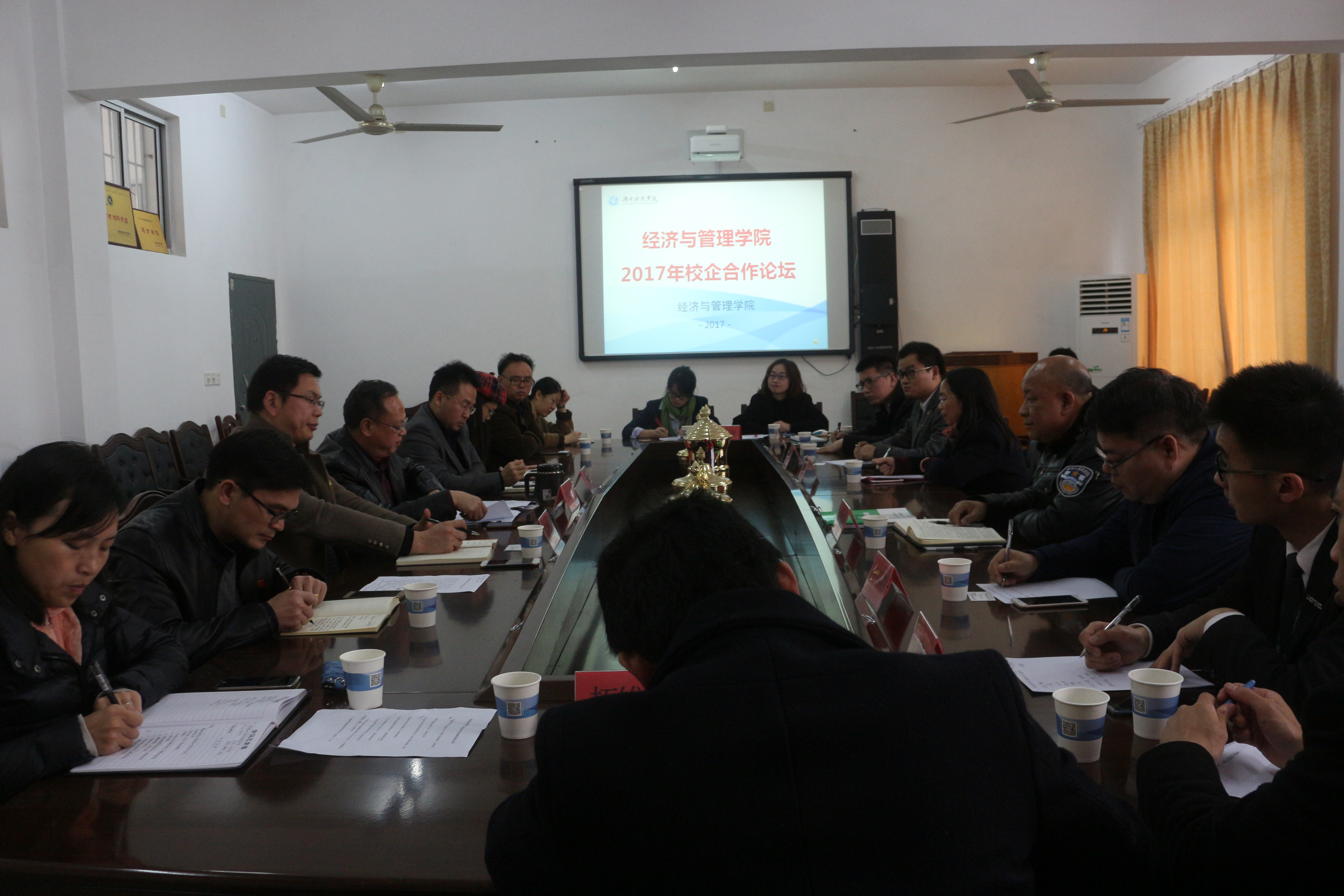 本网讯   12月2日下午,经济与管理学院在立信楼举办2017年校企合作论坛,拓维信息系统股份有限公司、深圳链家房地产经纪有限公司、湖南自然韵黑茶科技有限公司、湖南省中科农业有限公司、中国人民财产保险股份有限公司永州分公司等8家企业负责人应邀参加,学院院长李清泉教授,副院长兼副书记刘国华,以及各系主任、毕业班辅导员出席,党总支书记胡清华主持论坛。