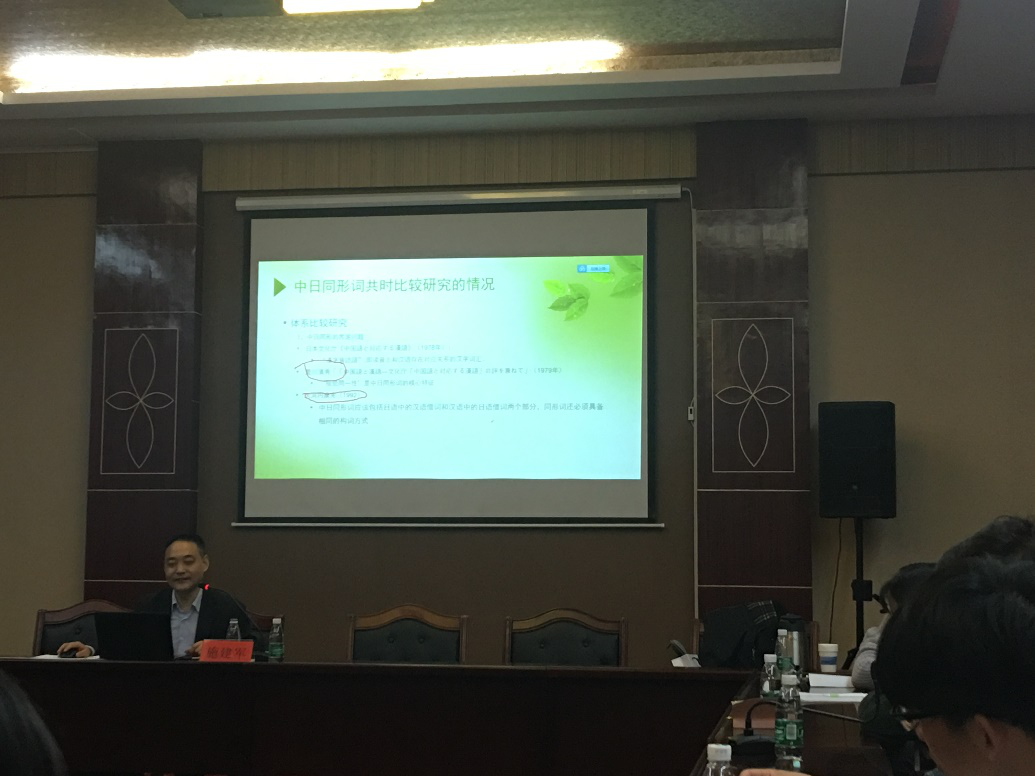 11月12日下午,施建军教授为大家做了题为“日语中的汉字词汇和中日同形词”的讲座。他介绍了日本从明治时代到现代日语中汉字词汇的使用情况,他说中日两国语言中存在着大量形态相似汉字词汇,我们称之为中日同形词(通用汉字词汇),通用汉字词汇在中日两国语言中的意义存在差异,并通过具体词汇进行分析说明。