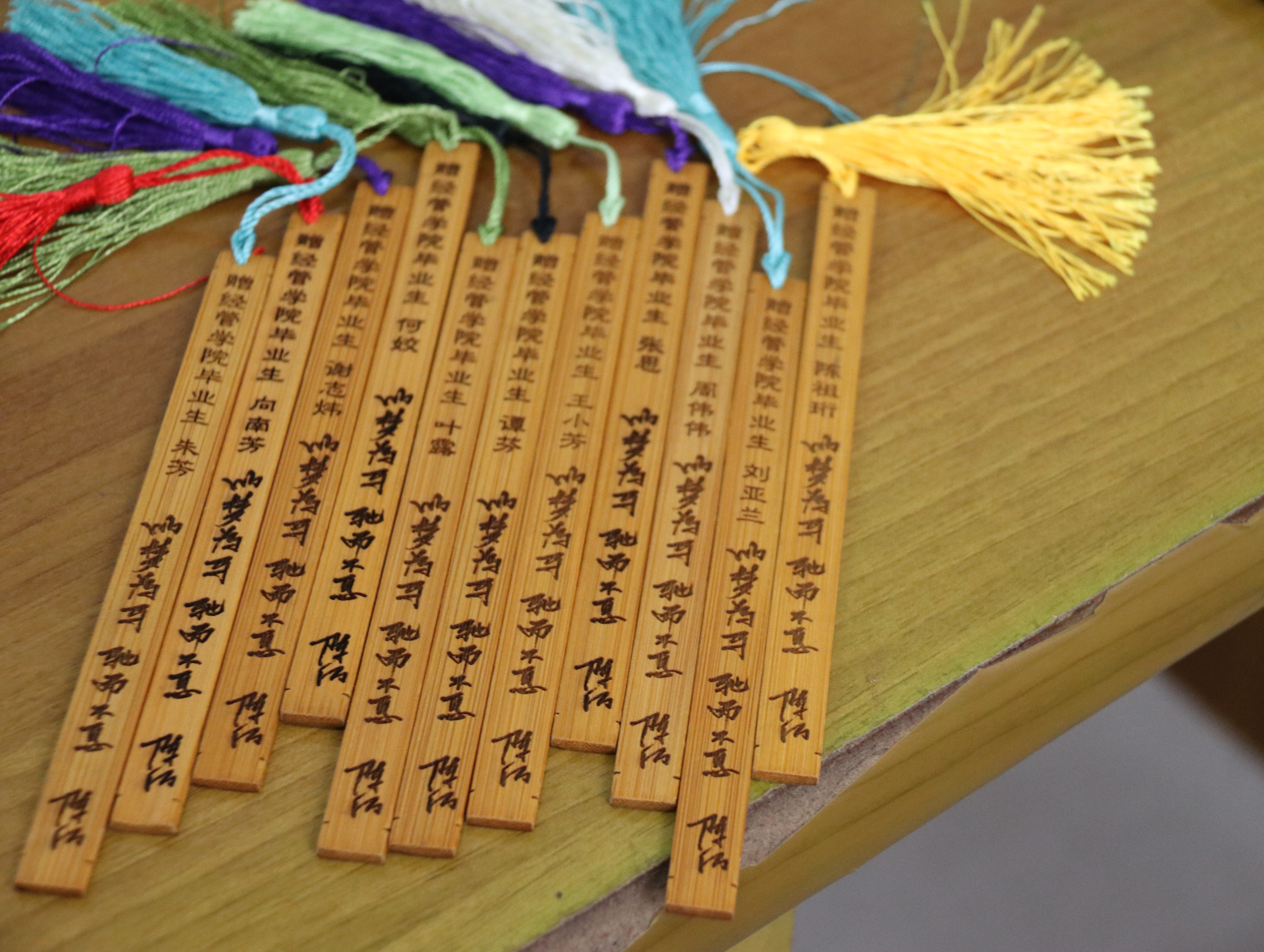 书签是木制长条形,一面刻有每一名毕业生的名字以及校党委书记陈弘书记“以梦为马,驰而不息”的寄语,希望每一位毕业生都能够怀着自己的梦想,永不停歇的愿望;另一面刻着米兰官方端网页版的校徽和“德才兼备,自强不息”的校训,同时还刻有竹叶,寓意着挺拔洒脱、正直清高的品质。