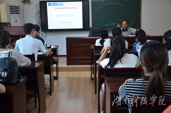 陈蒲清教授就“读何书”、“如何读”娓娓道来。他围绕“读何书”强调,读书要广博,既要做到“古今结合”、“中外结合”,又要做到“社会科学与自然科学结合”。他针对“如何读”提出以下三点意见:一是带着问题去读书,二是带着快乐的心态去读书,三是有选择性地读书。