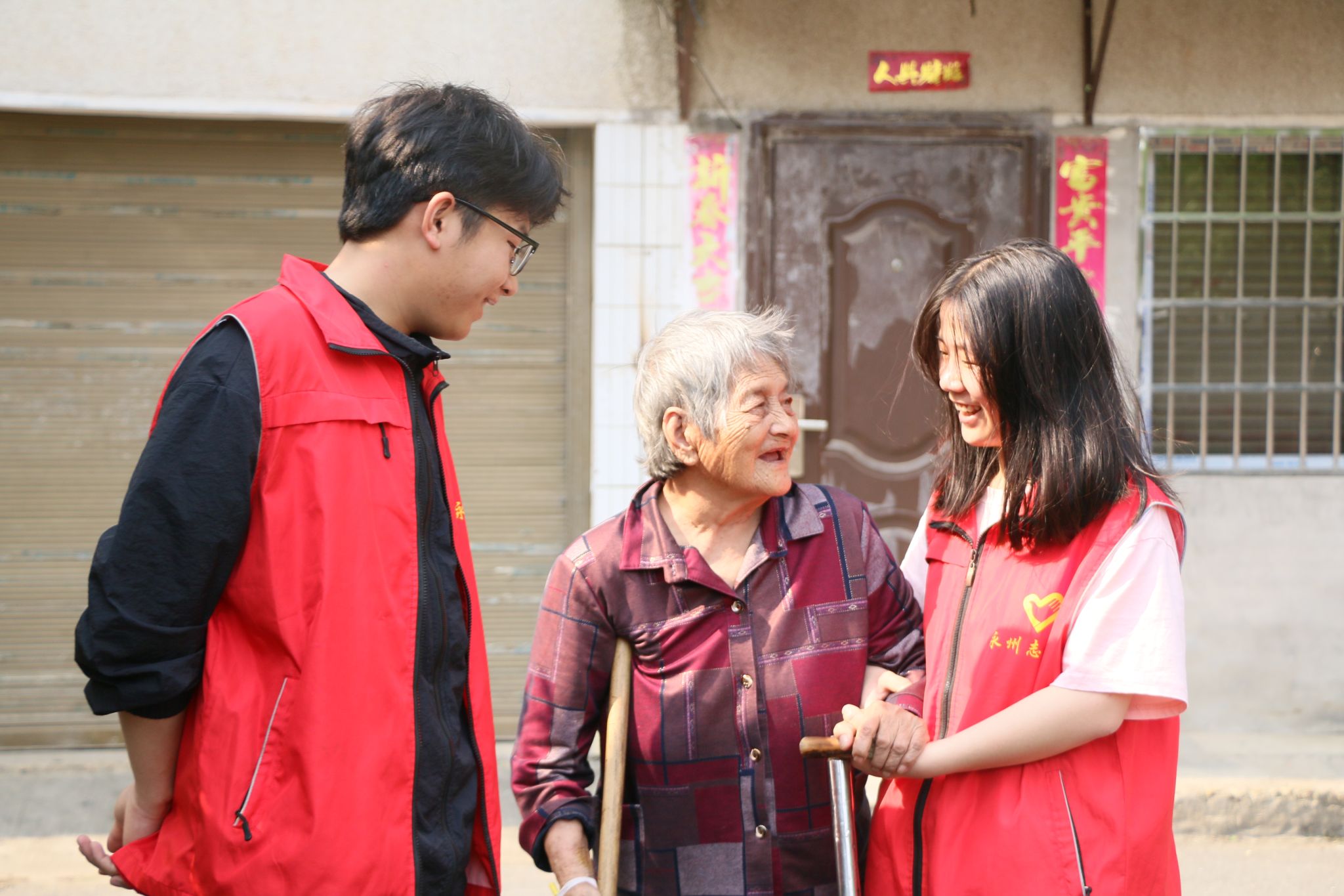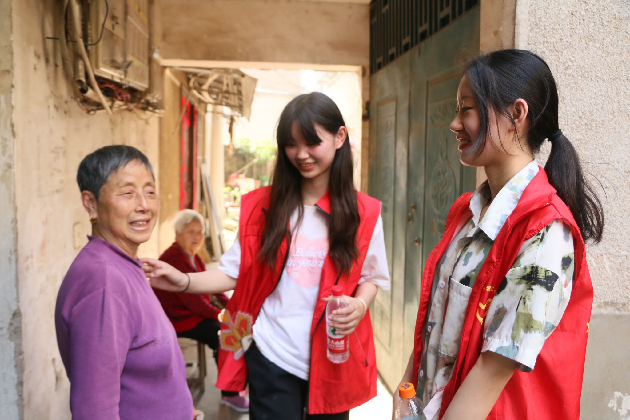活动期间,志愿者将爱心物品派发给社区的老人与小孩后,积极主动与老人聊家常,带小朋友做游戏,帮助老奶奶收被子,喷洒除草剂,搀扶老人回家等。整个活动充满了欢声笑语,其中一位80多岁的老奶奶握着一名学生的手说:“有你们来看我们,我们好高兴!”。