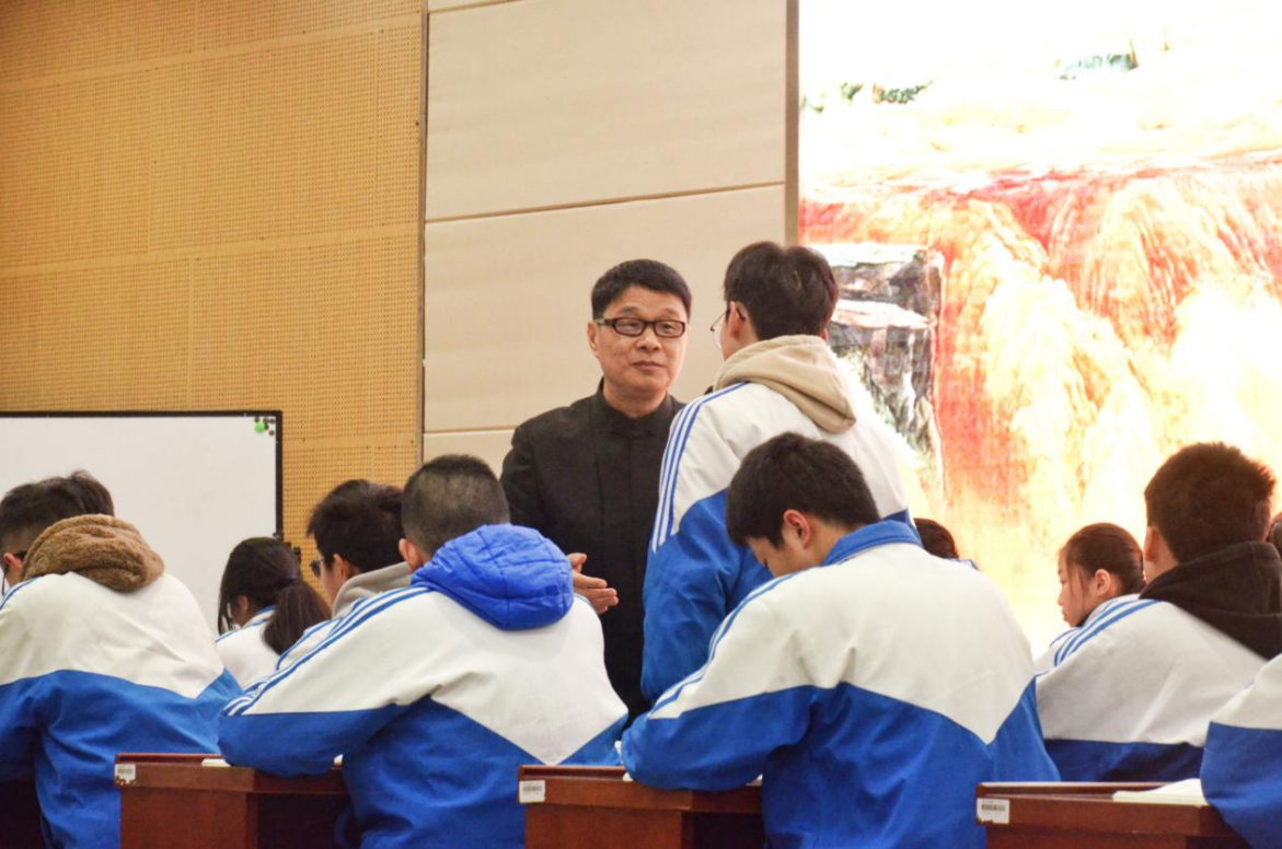 本次活动共分为两个环节。第一环节,肖培东老师与永州市九中学生共同完成了一堂《壶口瀑布》教学示范课。课堂主要为两部分:“专选——枯水季”“专选——引发理性思考”。肖老师紧扣课文中“专选”一词,与学生反复诵读感知课文,分析作者独特的观察角度,从壶口瀑布“丁”字形“一横”“一竖”的描写,引发学生对文字背后画面的想象,理会作者富有感染力的表达,整个教学过程充分体现肖培东老师“浅浅之中是至深”的教学理念。