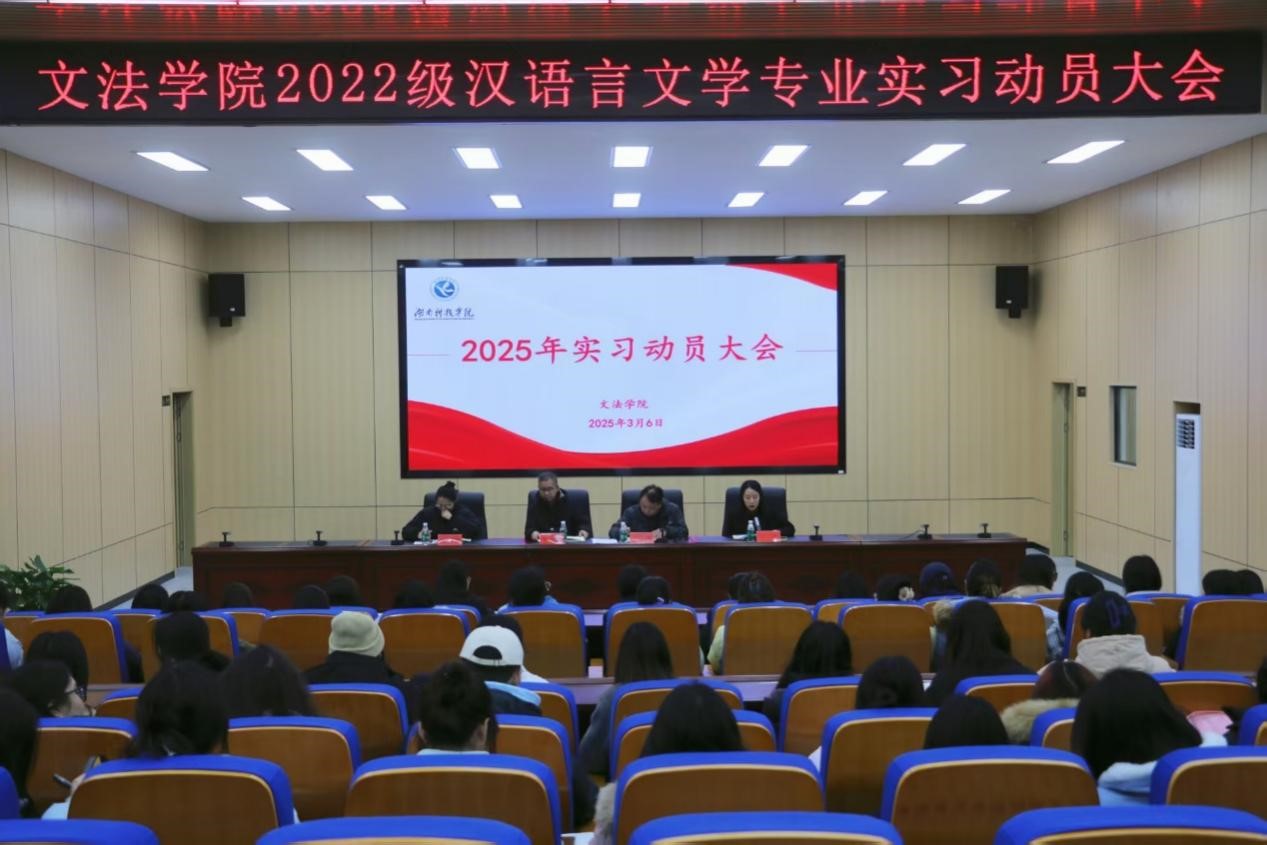 (通讯员:周莎 党紫怡 刘宇轩)为深化实践育人理念,提升实习生教学技能与职业素养 ,文法学院于3月6日晚在明德楼100会议室举行2022级汉语言文学专业实习动员大会。文法学院院长谷显明、副院长肖智成、实训部蒋嫦娥、辅导员王艺出席本次会议,2022级全体汉语言文学专业学生参加此次会议。