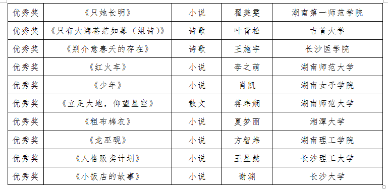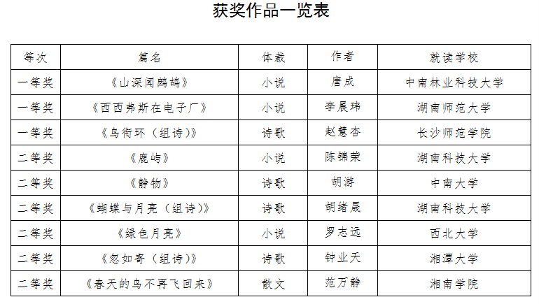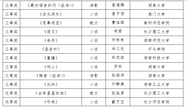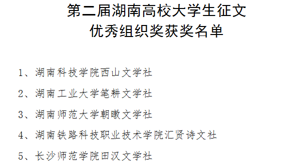 第二届湖南高校大学生征文活动共收到文学作品1100余篇(部),经初审、终评等程序,报省作协党组审定,共有31部作品获奖(特等奖空缺),5个文学社团获组织奖。为体现公开、公平、公正原则,现将评审结果予以公示,公示时间为2024年12月26日至2025年1月2日,共5个工作日。如有不同意见,请于2025年1月2日18时前,向湖南省作协组联部反映。反映情况要客观真实,以单位名义反映情况的材料要加盖单位公章,以个人的名义所反映情况的材料要署真实姓名并提供联系方式。