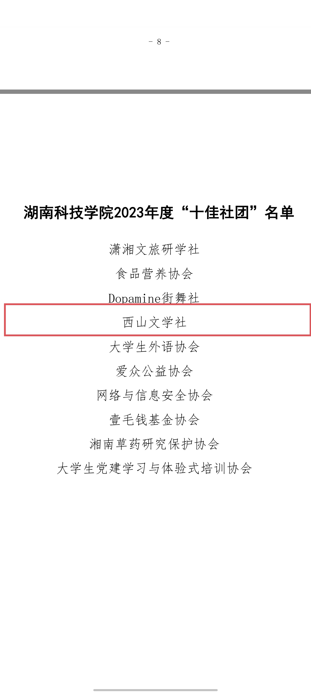 文学如灯,亘古长明。自1979年成立以来,西山文学社始终秉承“繁荣校园文化,培养文学新人”的理念,积极的地开展各项活动,在学校内外都产生了积极的影响。校内,我们开展了“蓝信封”活动和“写给2024”等活动,让文学给予我们感动和力量。校外,我们积极承办湖南省大学生征文活动,与湖南其他高校文学社紧密联系,交流合作。